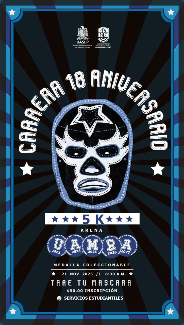 Este viernes 21 de noviembre, desde las 7:30 horas, con salida y meta en las instalaciones de la Unidad Académica Multidisciplinaria Región Altiplano (UAMRA) de la Universidad Autónoma de San Luis Potosí (UASLP), se llevará a cabo la décimo octava edición de la carrera atlética 5K, en conmemoración del 18 aniversario de la entidad en el municipio de Matehuala.