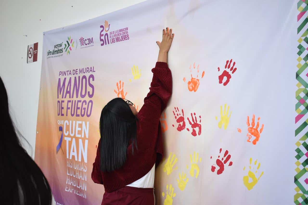 Además, se creó el mural colectivo Manos de fuego que cuentan historias, donde mujeres y familias expresaron mensajes de resiliencia y fuerza comunitaria. Estas acciones fortalecen las políticas del Gobernador Ricardo Gallardo Cardona de cero tolerancia a la violencia contra las mujeres y de protección a las potosinas.