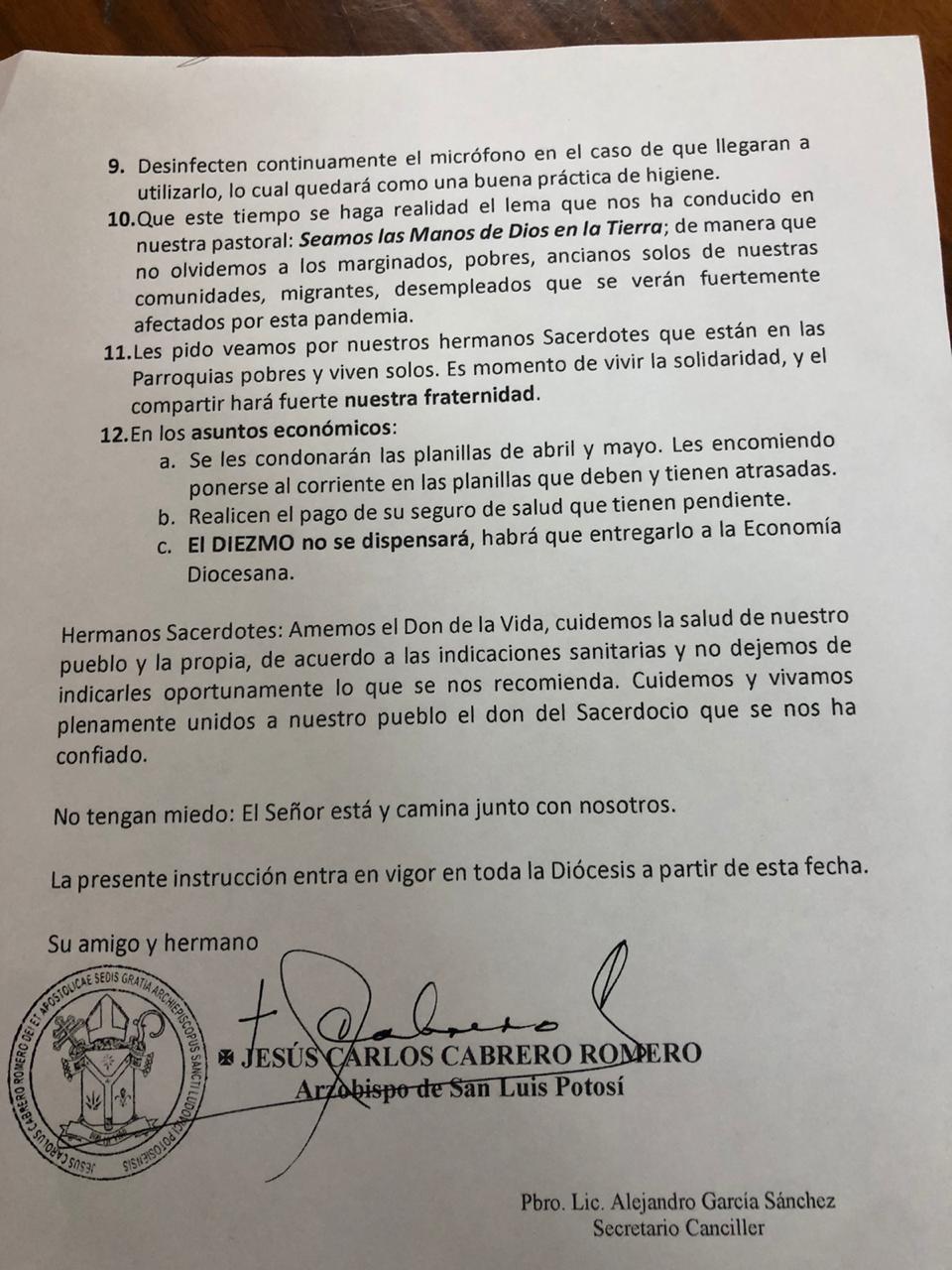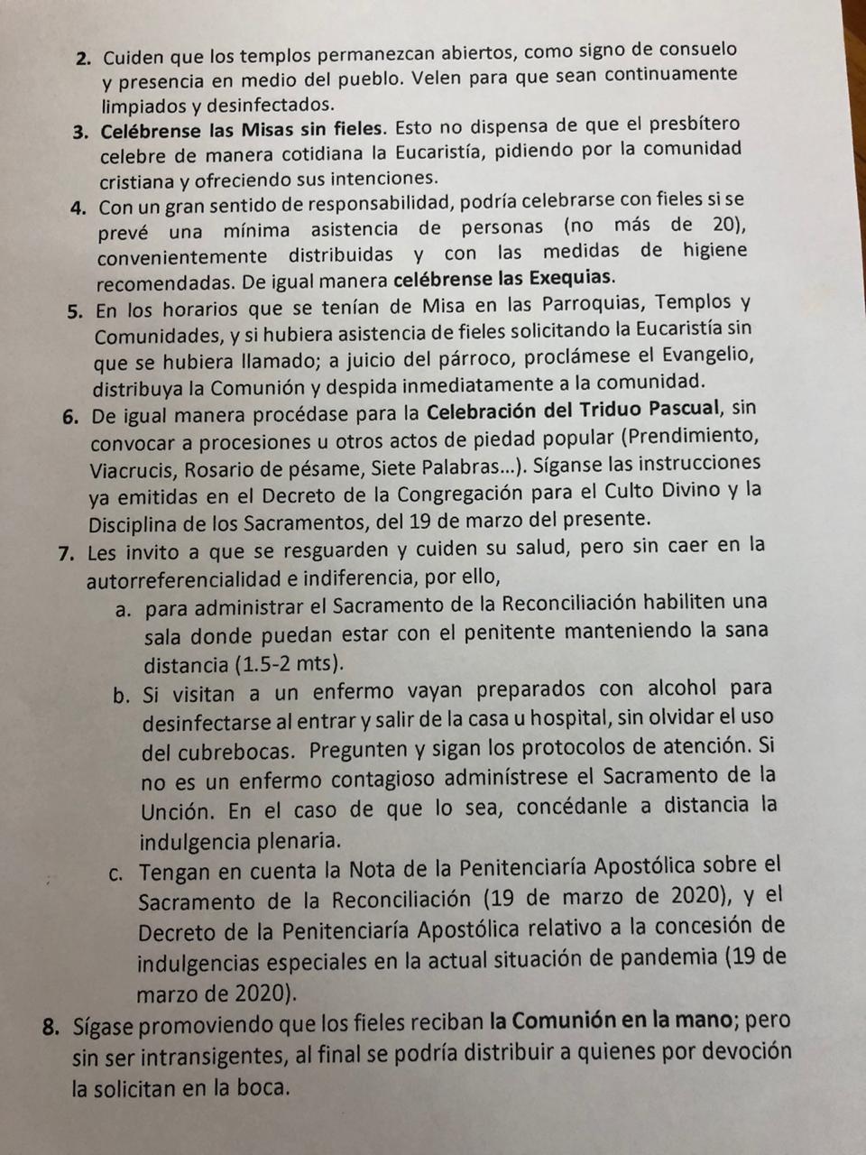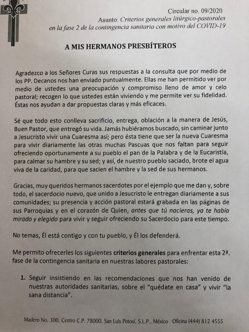 El sacerdote comenzó leyendo una carta que el arzobispo Jesús Carlos Cabrero hizo llegar a todos los padres de las iglesias en San Luis Potosí; en la epístola, el máximo jerarca de la iglesia potosina determinó algunas medidas que los clérigos tendrán que adoptar para sobrellevar la contingencia sanitaria, tales como el exhortar a los feligreses en continuar ejerciendo las medidas preventivas que el Sector Salud ha indicado; mantener las iglesias abiertas para que sean un signo de consuelo y presencia entre los creyentes; reducir a no más de 20-25 personas la celebración de la Eucaristía, entre otras.