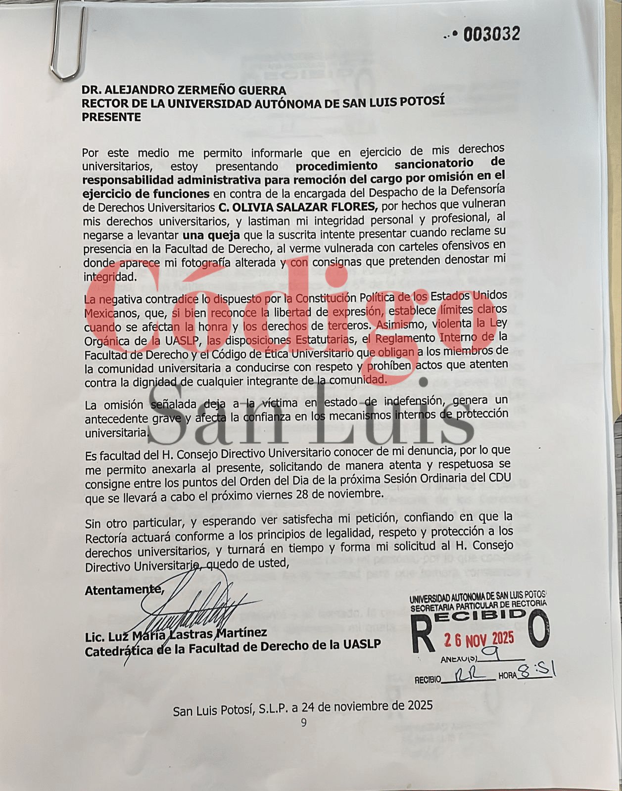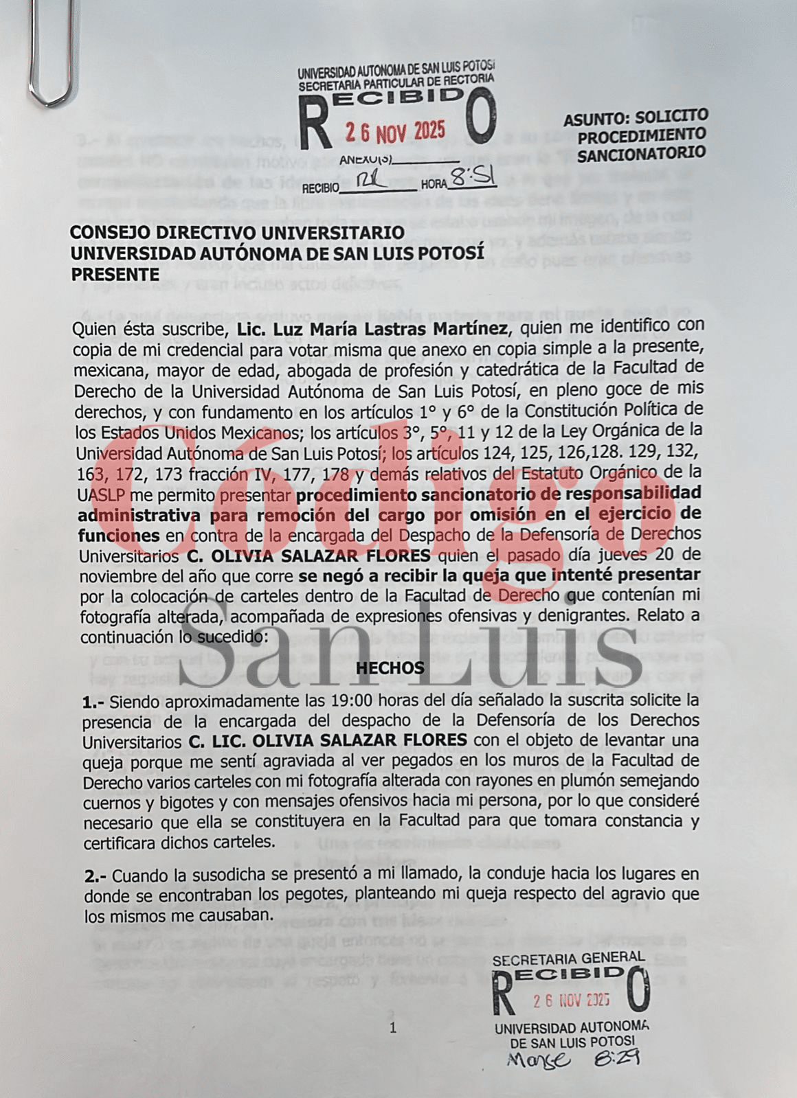 La catedrática de la Facultad de Derecho de la Universidad Autónoma de San Luis Potosí (UASLP), Lucy Lastras, presentó una denuncia formal ante el rector Alejandro Zermeño en contra de Olivia Salazar Flores, encargada del despacho de la Defensoría de Derechos Universitarios, a quien acusa de omisión, negligencia y violencia institucional. La académica afirmó que la funcionaria se negó a recibir la queja que intentó presentar el pasado 20 de noviembre, cuando pidió apoyo tras detectar la colocación de varios carteles ofensivos dentro de la Facultad de Derecho, donde aparecía su fotografía alterada con trazos denigrantes y mensajes que, según dijo, vulneraban su honra, integridad y derechos como integrante de la comunidad universitaria.