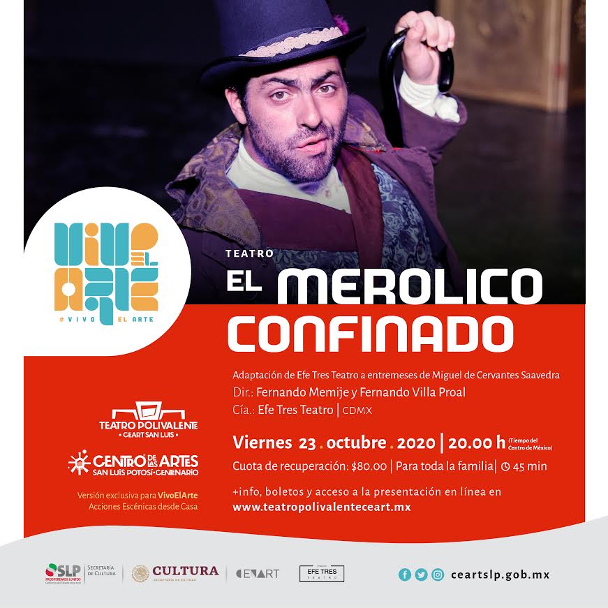 A entremeses de Miguel de Cervantes Saavedra: “El merolico confinado” y sus remedios para el alma se presentan este viernes 23 de octubre de 2020 a las 20:00 horas, con Fernando Villa Proal en escena, Ana Lilia herrera en asistencia de dirección y Allan Flores Props como productor. Una serie de historias que permitirán descubrir el lado hilarante del mundo en crisis al que nos enfrentamos, un momento para recordar que aún tenemos la oportunidad de reír a pesar de todo.