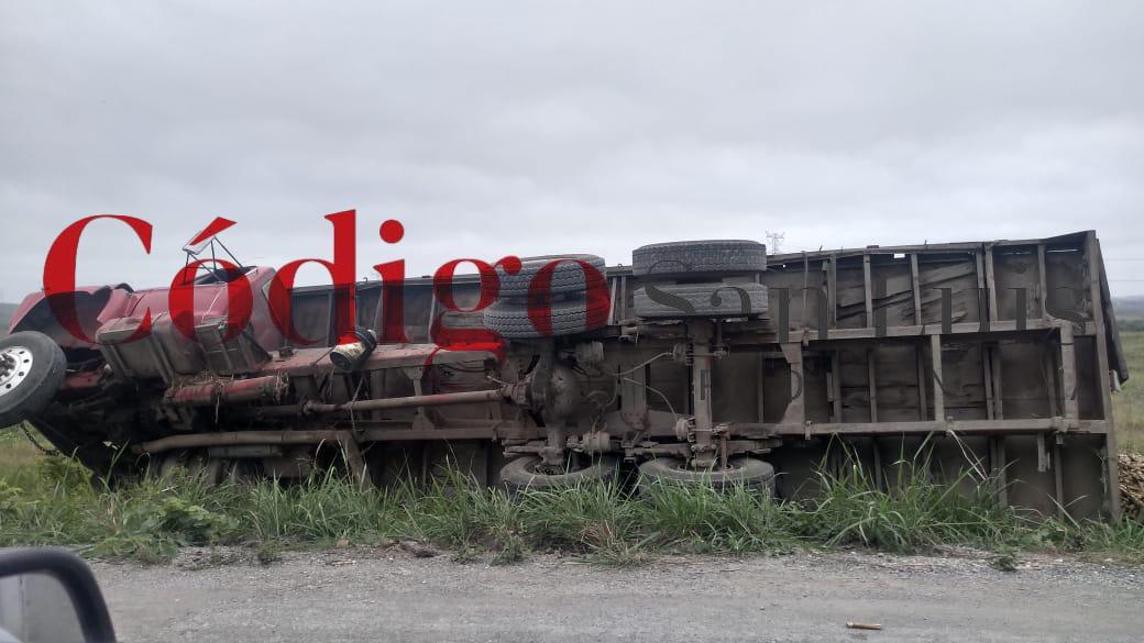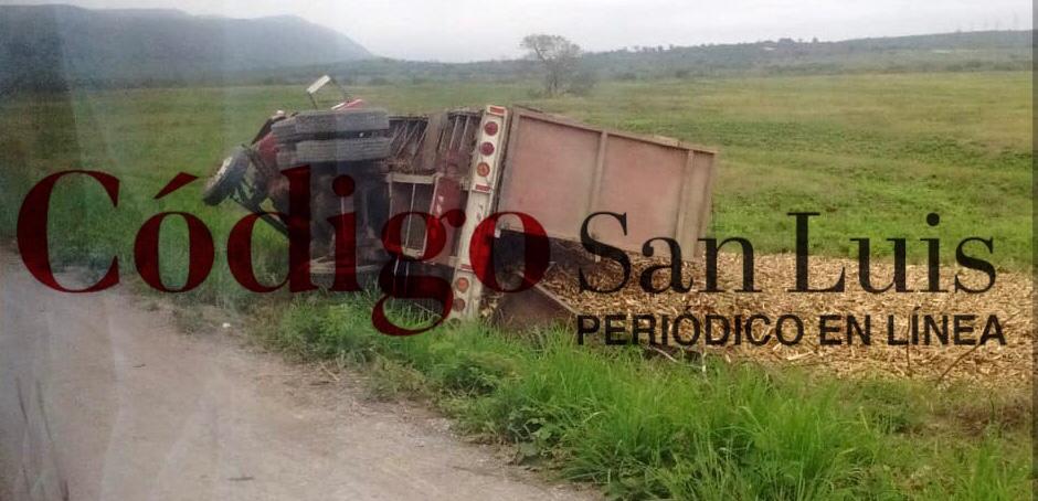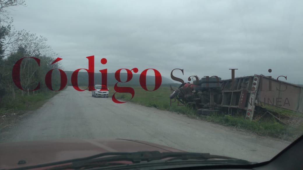 Valles SLP.- La mañana de este miércoles, volcó un camión cañero en la carretera Ciudad Valles – El Naranjo, dejando solo daños a la unidad.